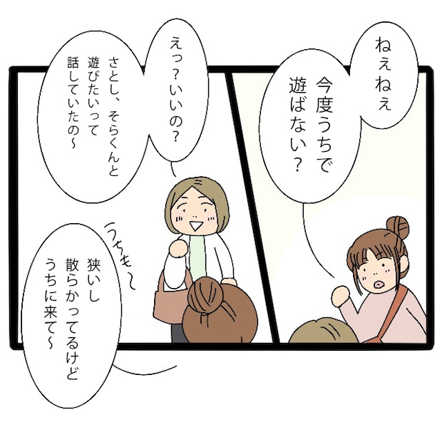 「ねぇねぇ、今度うちで遊ばない?」私はさとしくんママを家に誘います。「えっ?いいの?さとし、そらくんと遊びたいって話していたの~」突然の誘いに嬉しそうな表情を浮かべるさとしくんママ。私もそれに合わせるように、「狭いし散らかってるけど、うちに来て~」と笑顔で言いました。