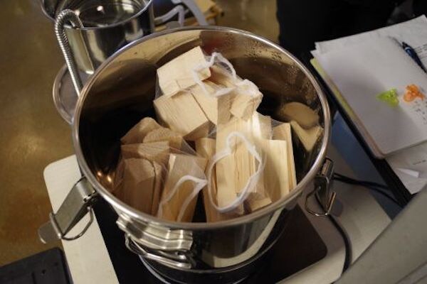 次に、加工した木材から水蒸気蒸留を用いて「芳香蒸留水」を取り出して、ビールに添加。バットに使用される木材は香りが強くないが、蒸留することで効率的に香りを抽出することができるのだそうだ。