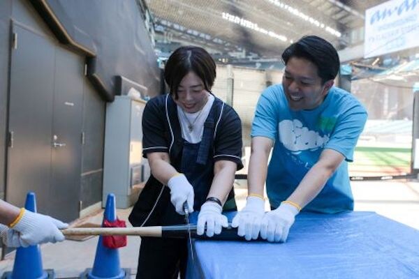 クラフトビール完成までの流れはこうだ。まず、9月27日(土)にファイターズファンと、ビール醸造に使いやすくするための加工作業を実施。今年は昨年の2.5倍となる50名が参加し、のこぎりやナタを使って、実際に選手が使用していたバットの汚れや塗装を落とした。