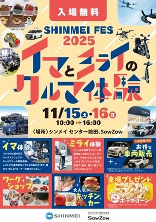 新明工業は、11月15日(土)・16日(日)、「イマとミライのクルマ体験 ーSHINMEI FES 2025-」を、シンメイ センター前田とSowZowで開催する。