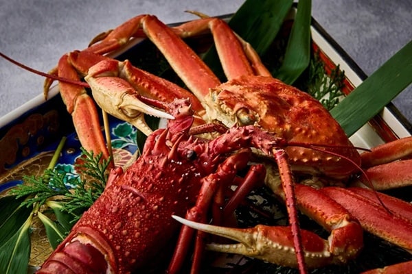 甲殻類の二大巨頭「蟹」と「海老」。冬の味覚の王様と呼ばれるズワイ蟹と、伊勢海老をはじめ、車海老、甘海老を一つの調理法で同時に食べ、それぞれに違う甘みと旨みを持つ海の幸を一度に味わえる特別な会席を「旅荘 海の蝶」にて用意。