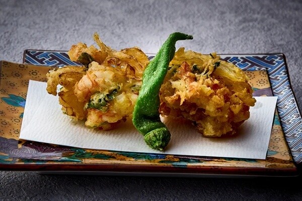 揚物の「ズワイ蟹かき揚げと甘海老かき揚げ」も堪能しよう。さっくりと揚げたかき揚げは、海老と蟹の甲羅を香ばしく焼き上げ、細かく砕いて塩と合わせた料理長特製の塩を添えて提供。ズワイ蟹、甘海老のうまみをそのまま楽しむもよし、特製の塩でさらに海老と蟹の風味を楽しむもよし、という一品だ。