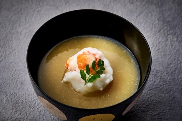 留椀「牡丹海老真丈 袱紗味噌汁仕立て」だ。
