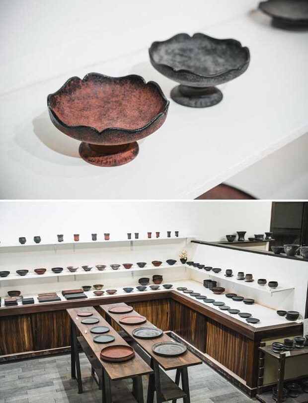 上/地ノ器 稜花台皿 脚付き各13,000円。朱色は工房の近くで採れる土を使用。窯の中に発生する煤を表面に吸着させて独特の色を出す 下/作品の見やすさを重視したディスプレイ