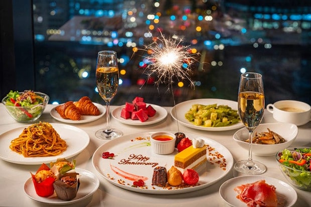 記念日には「天空のアニバーサリープラン」がおすすめ。通常のビュッフェに加え、こだわりのワインを含む約25種類のプレミアムドリンク飲み放題と、季節のオリジナル記念日デザートプレート(1組につきひとつ)が付いた特別感あふれるコースは、大切な人との時間を華やかに彩ってくれるはず。