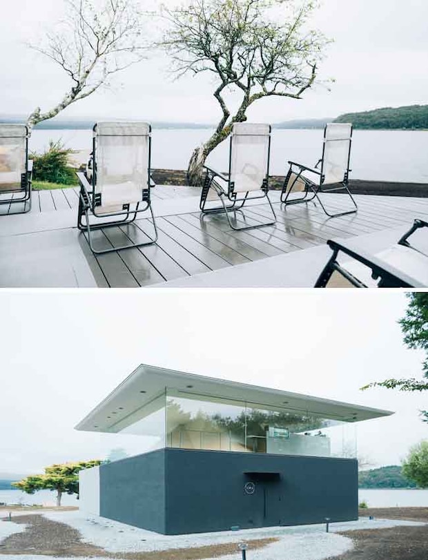 上/オープンエアの外気浴スペースを新設 下/建築家・百枝優デザインの建物は、笠雲の富士山がモチーフ。2Fが休憩スペースに