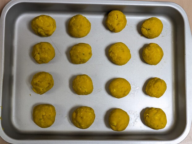 かぼちゃ1/2個で一口大のタネが16個出来ました。
