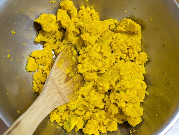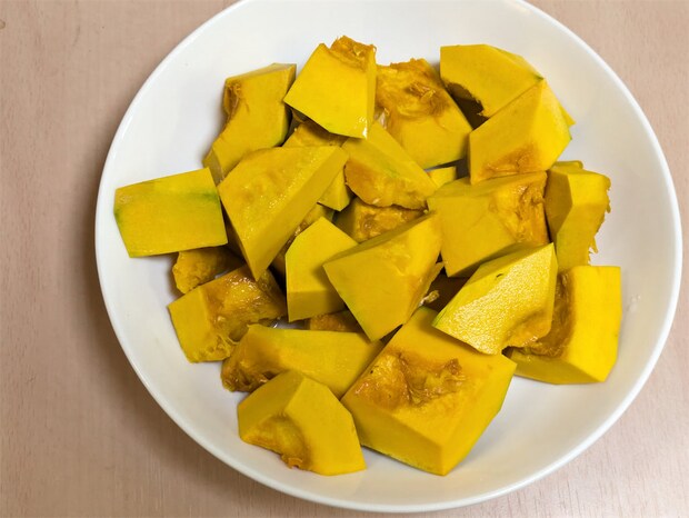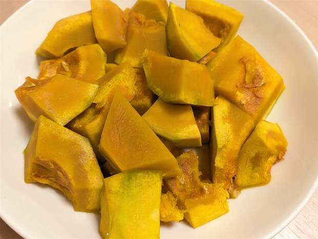 加熱後のかぼちゃがこちら。かぼちゃの柔らかさにムラがあるときは、30秒〜1分ずつ加熱時間を追加しましょう。