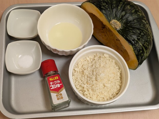 1. かぼちゃは種とワタをとり、皮を剥いて食べやすい大きさに切る。