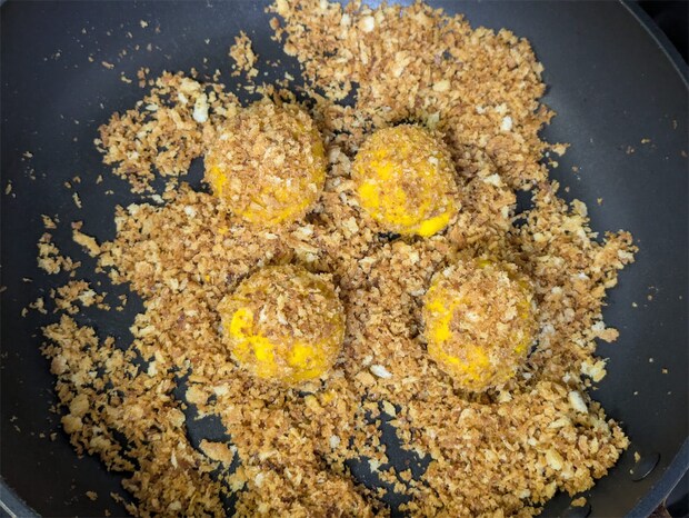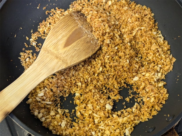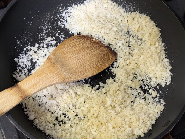 4. フライパンにサラダ油を熱し、パン粉を入れてきつね色になるまで炒める。粗熱をとる。