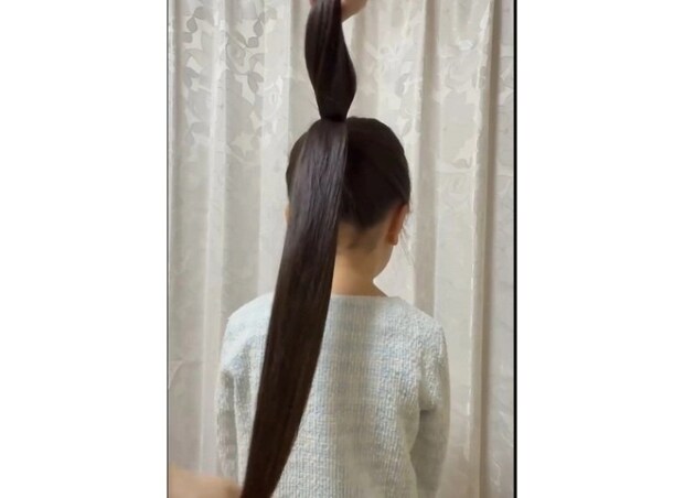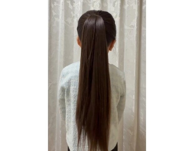 ②で結んだ毛束を、上下に半分ずつの量に分けます。