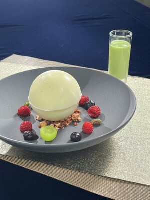 ホワイトチョコレートのドームの上にアボカドのソースをかけて、プリンセスケーキをイメージ。アボカドとチョコレートという、メキシコで出会った味を取り入れました。