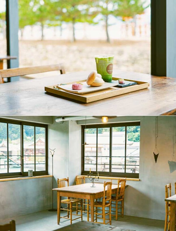 揚げもみじが名物の「紅葉堂」が手がける、ギャラリーを併設したカフェ・MAGOJii cafe & gallery 。参拝客でにぎわう通りから少し離れた御手洗川のほとりにあり、川のせせらぎに耳を傾けながらのんびり過ごすことができる。人気の和菓子セットには、地元の和菓子店や製餡所から仕入れたサクッと軽いもなかの皮とやわらかな粒あんを使用。香り豊かな抹茶ラテと一緒に、嚴島神社の大鳥居を望む窓際の特等席から世界遺産の景色を楽しもう。