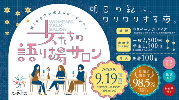 愛媛県主催の女性限定シンポジウム。多彩なゲストのトークや参加者同士の語り合いを通して、未来の自分に出会える特別な夜。非日常感ある会場でカジュアルディナーを楽しみながら、新しい価値観やつながりを発見できます。