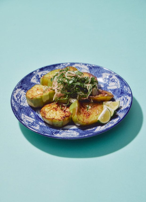 【1】青じそはせん切り、みょうがは輪切りにして10秒ほど氷水にさらし水気を切る。すだちはくし形切りにする。白丸なすは縞目にピーラーで皮を剥き、2cm厚さに切る