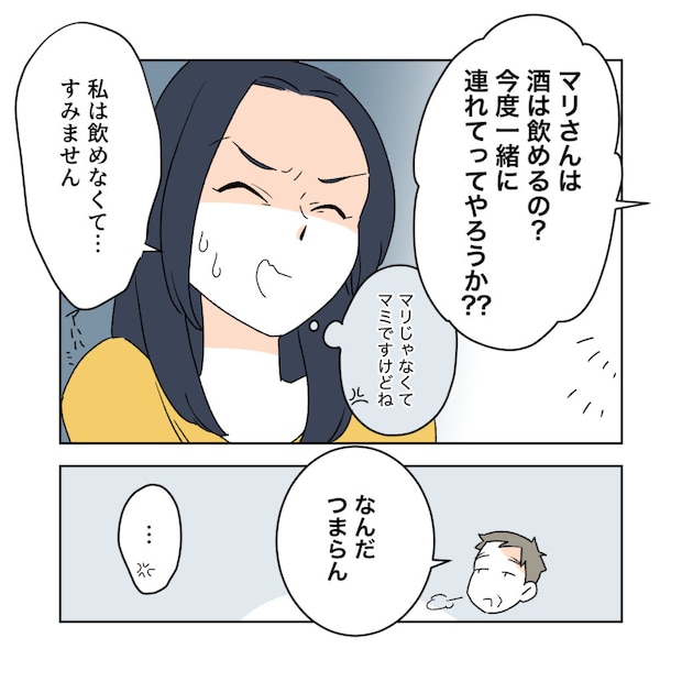 すると、義父が私に「マリさんは酒は飲めるの?今度一緒に連れてってやろうか??」と話しかけてきました。私は「マリじゃなくてマミですけどね」と心の中で突っ込みながら「私は飲めなくて・・すみません」と愛想笑い。すると、義父は「なんだつまらん」と大きなため息。さっきから人のことをコレ呼ばわりしたり名前を間違えたり、つまらないと言われたり・・私は義父の態度にだんだん腹が立ってきました。