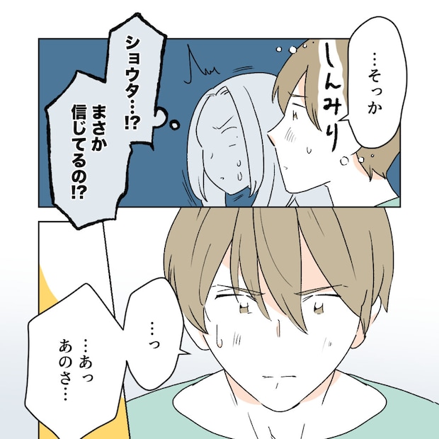 ふと横を見ると「・・そっか」と呟きしんみりしているショウタ。「ショウタ・・!?まさか信じてるの!?」義父の言葉を信じ切っているショウタに驚いていると、突然ショウタが「・・あっ、あのさ・・」と意を決したように口を開きました。