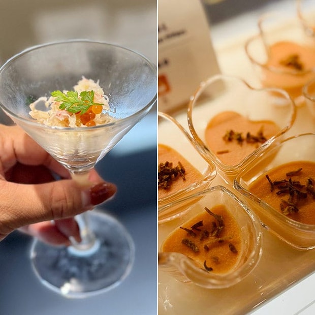 「人参のババロア オニオンフリット添え」は、かわいい器に盛り付けられていますね。ふわふわ食感のムースの上に、フライドオニオンをトッピング。玉ねぎの香ばしさ、風味がアクセントになっています。