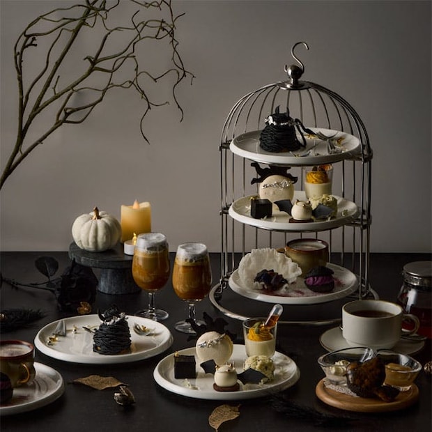 竹炭のパウダーを使用したセイボリーとドリンクもダークなハロウィン仕様で、ミステリアスな世界観を心ゆくまで楽しめそう。