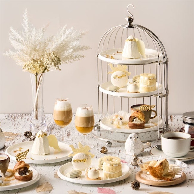 天使の形をあしらい、栗の芳醇な香りが魅力のメインスイーツ「ホワイトエンジェル・モンテビアンコ」をはじめ、安納芋クリームをはさんだ純白のマカロン、口の中でとろける雲のようなチーズケーキなど、秋の深まりを感じさせる繊細なスイーツが勢揃い。