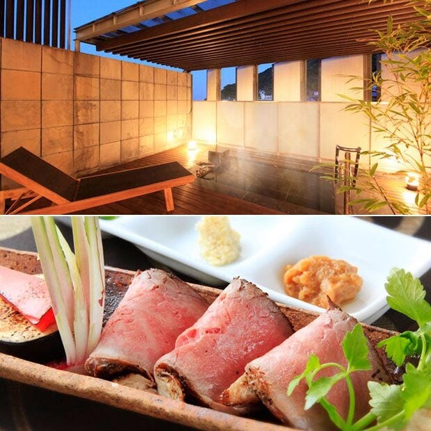 上/露天風呂は源泉かけ流し。内湯にはジェットバスも完備されている 下/夕食のメインは静岡牛のローストビーフ。ほかに季節の素材を使った品々も