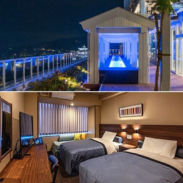 上/14Fの展望足湯庭園では、小田原の町並みと海を眺めながら天然温泉の足湯に浸かれる 下/広めの「スーペリア・ツインルーム」をひとり占めできるプランも