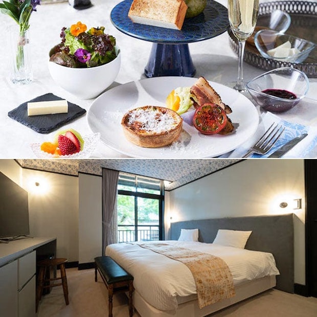 上/コース仕立ての朝食。メインはフレンチトースト、キッシュ、カレーから選べる 下/モデレートのお部屋。客室は13室のみで高校生未満の宿泊お断りという大人の宿