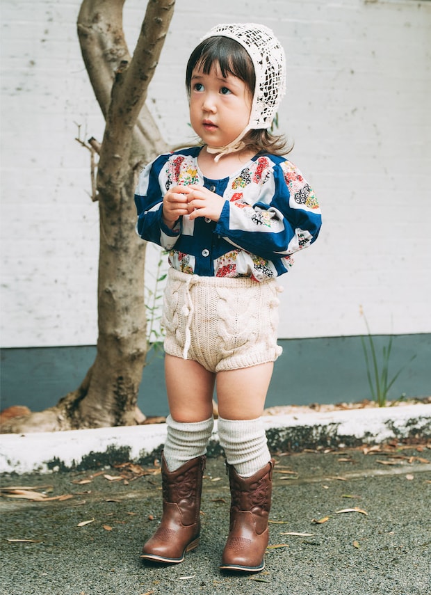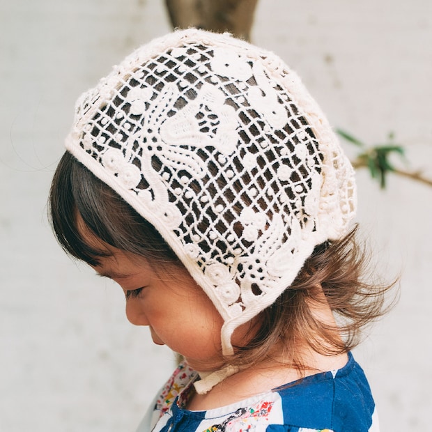 細かな刺繍が目を見張る『リール』のボンネット。トップスと雰囲気をシェアして、ロマンティックにまとめて。
