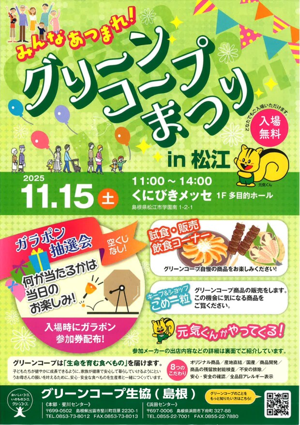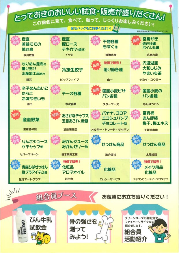 グリーンコープ自慢の商品の試食・販売コーナーや空くじなしのガラポン抽選会など楽しいイベントがもりだくさん!