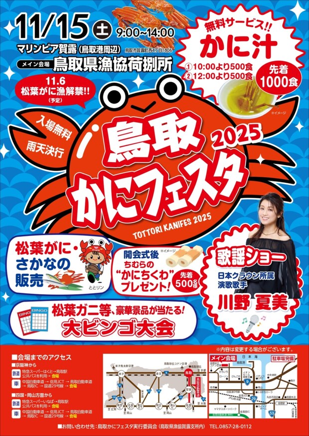 当日は、「松葉がに」をはじめ新鮮な魚などの即売、かにの宝くじ、親がに無料配布、ステージイベントなど盛り沢山のイベントが行われる予定です。