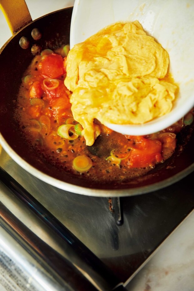 ④ ❸のフライパンに残りの油を強めの中火で熱し、赤唐辛子、トマト、塩を入れてさっと炒める。水大さじ2を加えて1分ほど炒め煮にし、水分がとんできたらねぎを加えてさっと炒める。❸の卵を戻し入れ、からめるようにしてさっと火を通す。器に盛り、黒こしょうをふる。