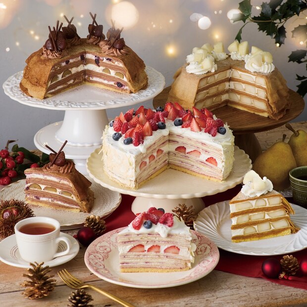 東京、大阪、静岡、神奈川で展開する「アフタヌーンティー・ラブアンドテーブル(Afternoon Tea LOVE&TABLE)」は11月13日より、「ベリーとマスカルポーネのクリスマスミルクレープ」と2025年の新作「ラ・フランスと自家製キャラメルクリームのミルクレープ」および「マロンとチョコレートクリームのミルクレープ」を展開する。