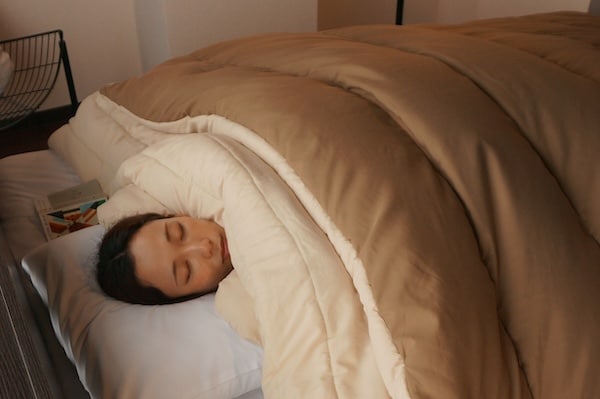 普段の布団と一緒に使える点もポイントで、普段使っている布団の上に掛けて使えば保温力がアップ。寝袋由来の軽くて暖かさをため込む中綿を使用しているため、広く優しく包み込まれるような感覚で心地よく眠れる。