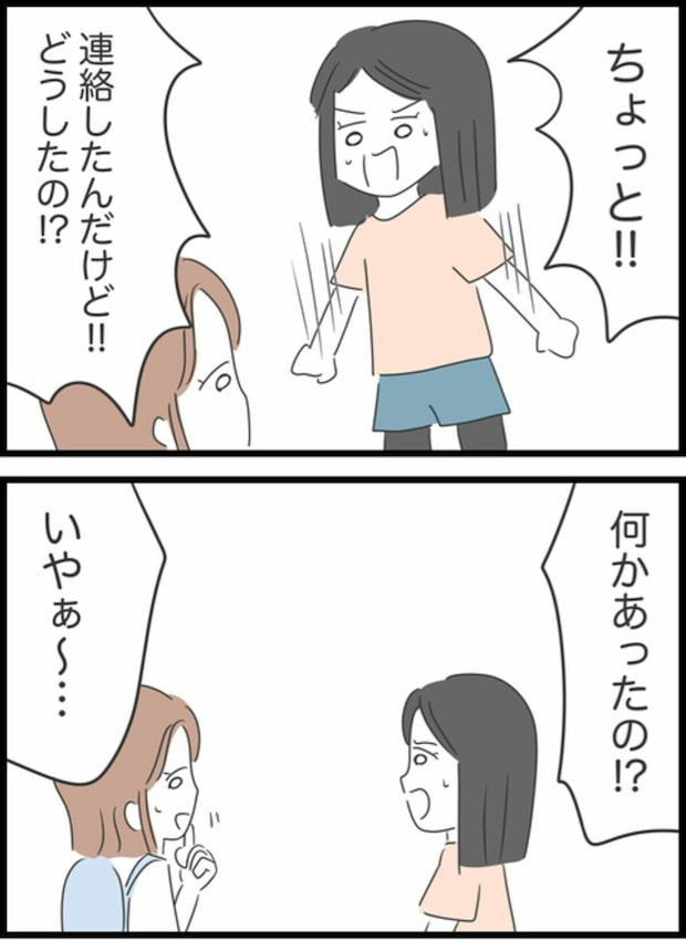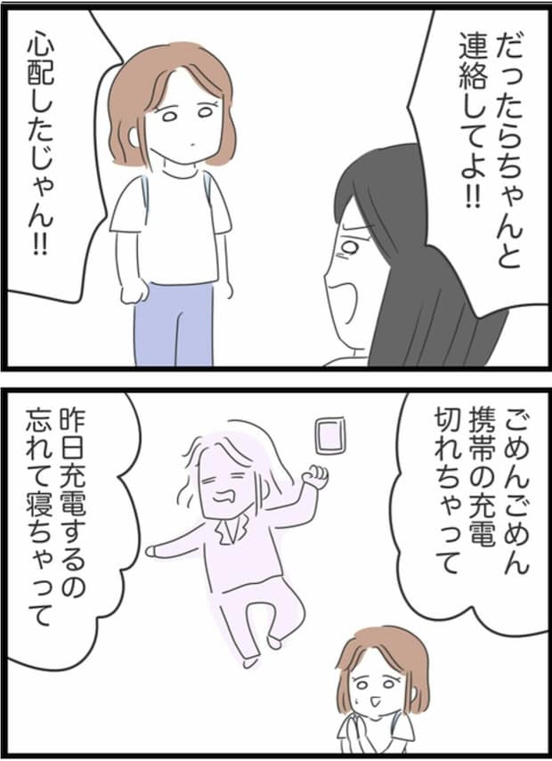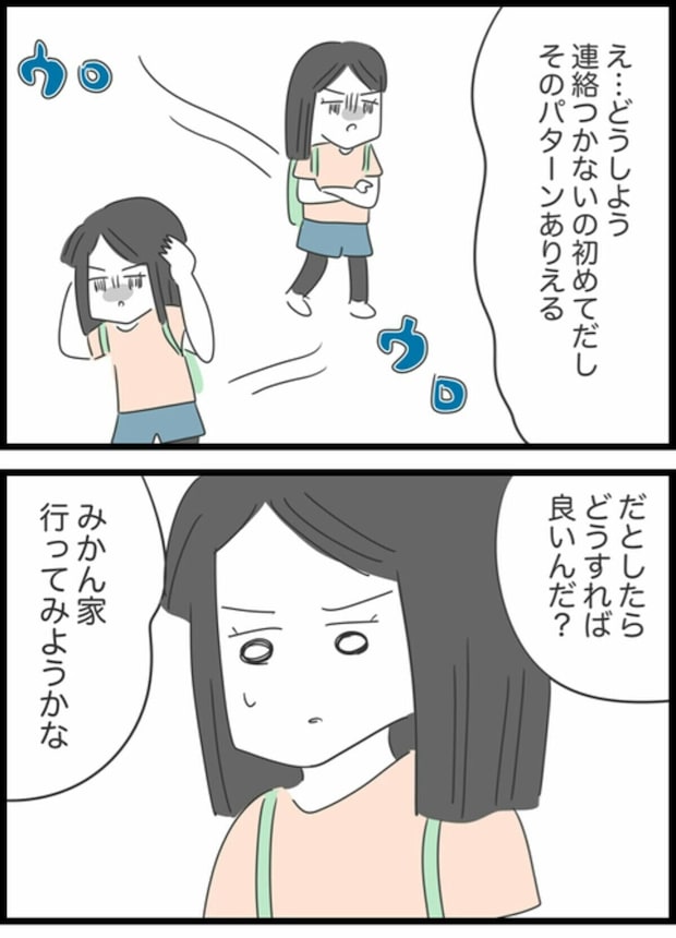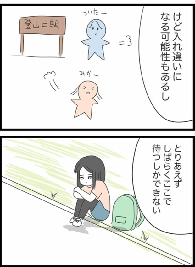 集合場所である登山口でみかを待っていたゆうこ。しかし、時間になってもみかは現れず、携帯に電話しても音信不通。遅刻はあっても連絡がつかないことは初めてだったため、ゆうこはどうするべきか頭を悩ませます。行き違いになるよりはとその場で待つことにしたゆうこ。しかし、待っている間もみかに何かあったのではと悪いことばかりが頭をよぎっていました。遅刻はいつものことでも、連絡がつかないというのは不安になりますよね。