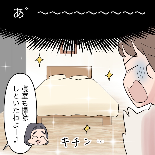 買い物を終え家に帰ると、玄関に謎の女性の靴が!慌てて部屋に入ると見違えるようにキレイになったリビングが!すると平然と掃除しながら「帰ったの~」と自分の家のように言う義母。夫に鍵を借りて合鍵を作ったと聞いてドン引きしていると、「散らかってたから掃除しといたわよ~」と義母に言われ、「・・まさか!」と部屋へ向かって走りました。