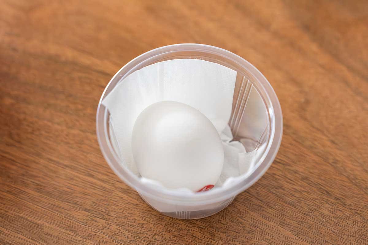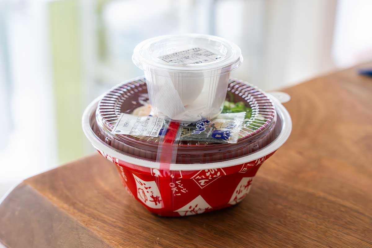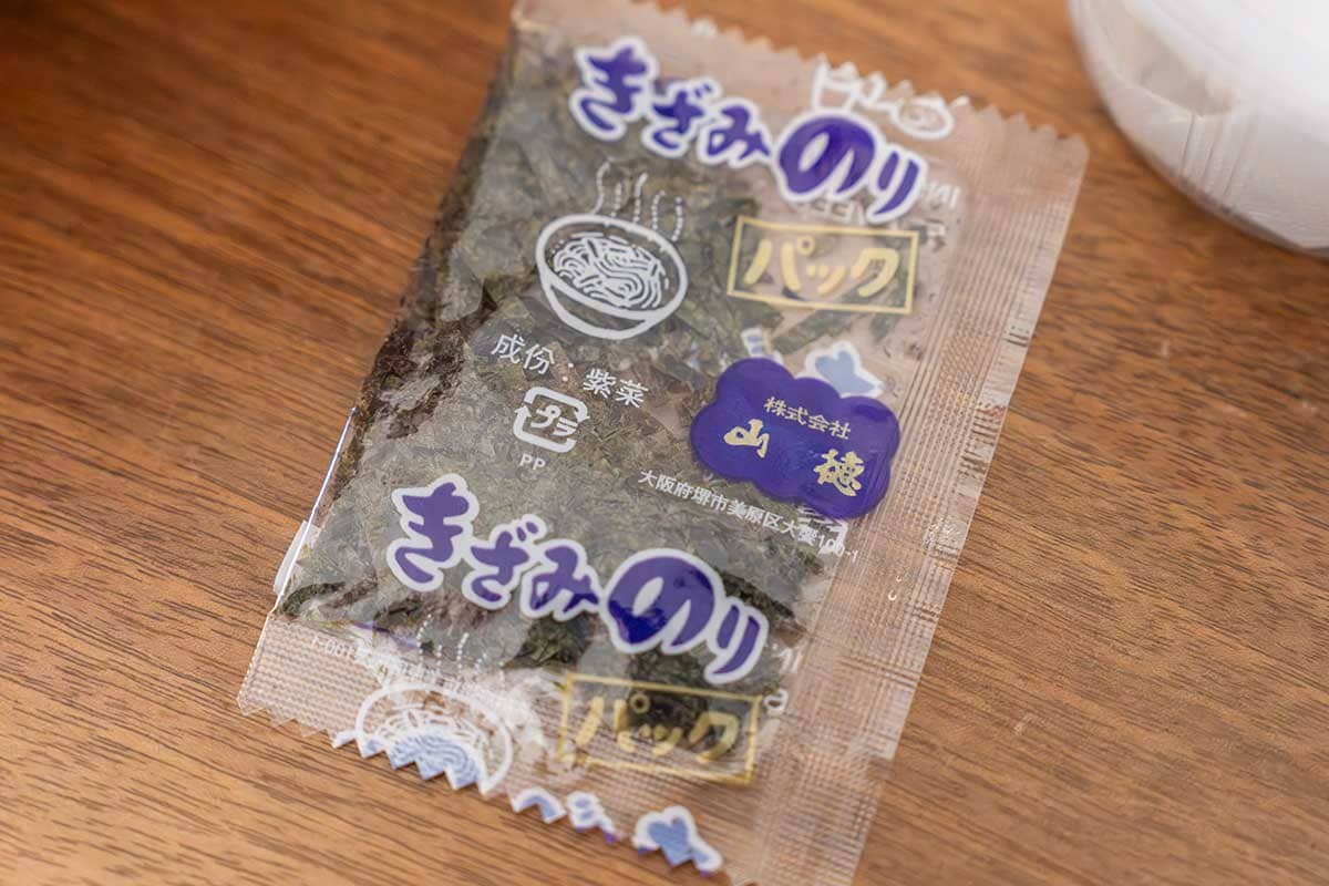 うどんの容器とは別に、温たまが入ったカップと、きざみ海苔の袋が付いていますね。