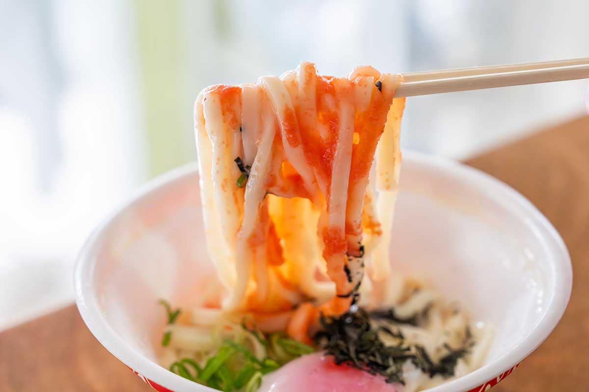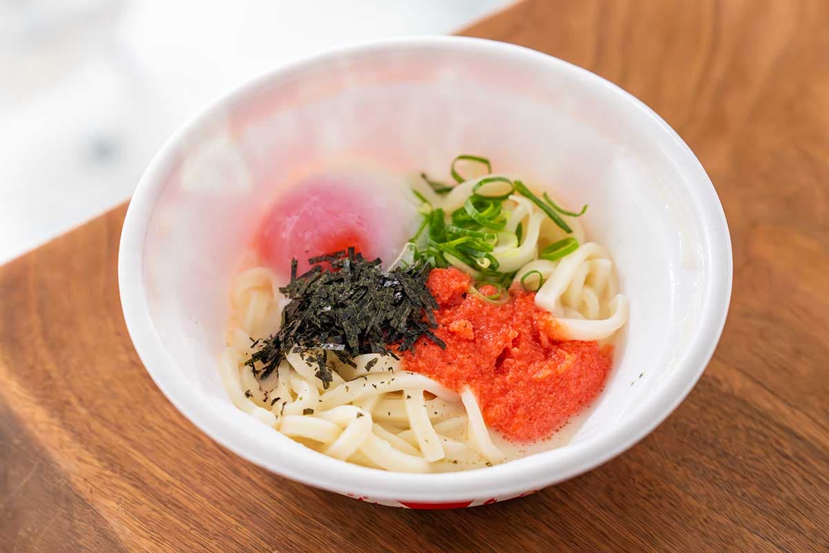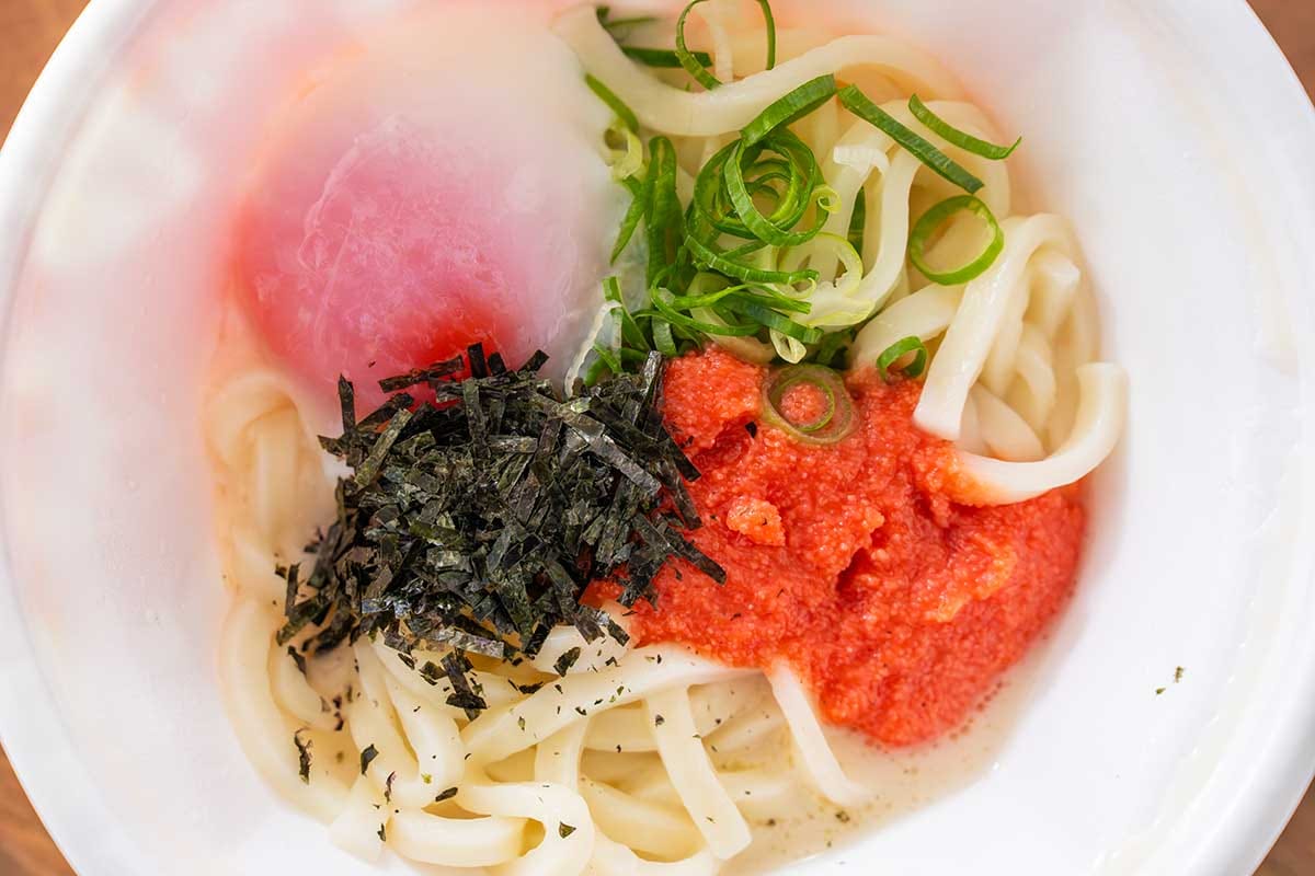 鰹と昆布のうまみが詰まったうどんだしに、北海道産生クリームを使ったまろやかなホワイトクリームと、ピリッと辛い明太子がよく合っています。さらに、刻み海苔と青ねぎの風味がよいアクセントになっているから、味が単調にならず最後までおいしく楽しめますね。