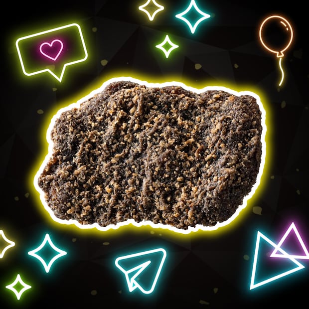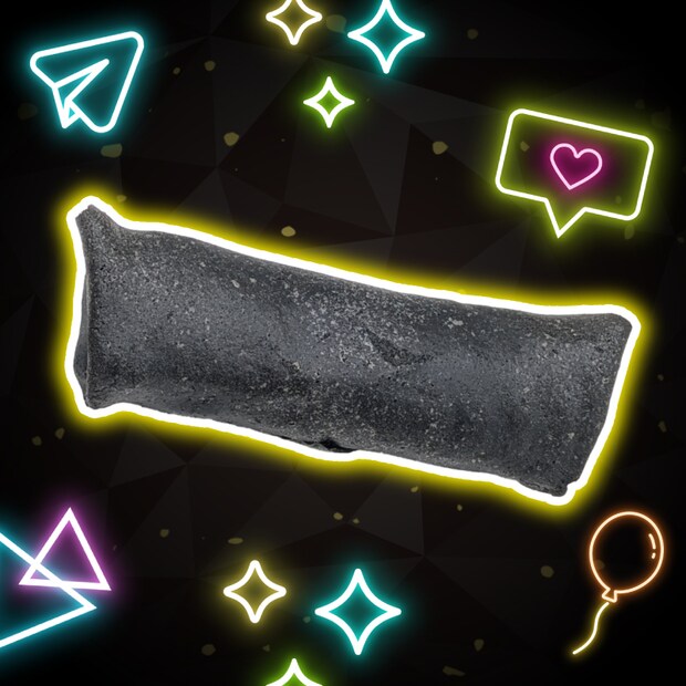 真っ黒な外観が強い印象を与えるメロンパンです。黒いパン生地に黒いビスケット生地を合わせた、全体が黒いメロンパンです。