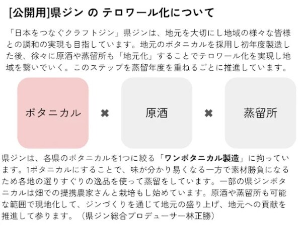 ご当地ならではの特産品をボタニカルに使用し、美味しさにこだわるのはもちろん、地域の魅力やお酒を片手に集まる場での楽しいコミュニケーションのツールとして、都道府県ごとの魅力の発信や地域活性化、生産者や販売者をつなぐネットワークづくりを行っていくとしている。