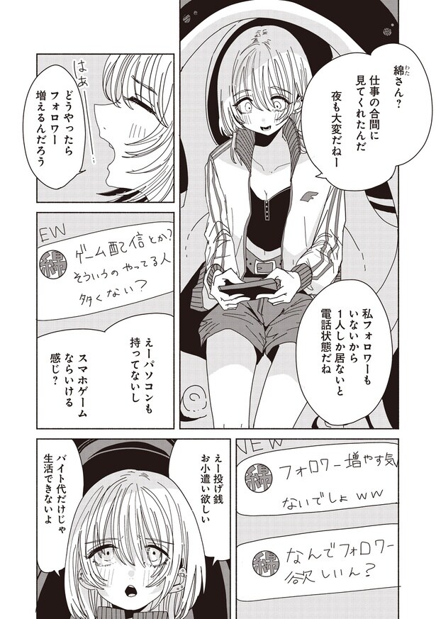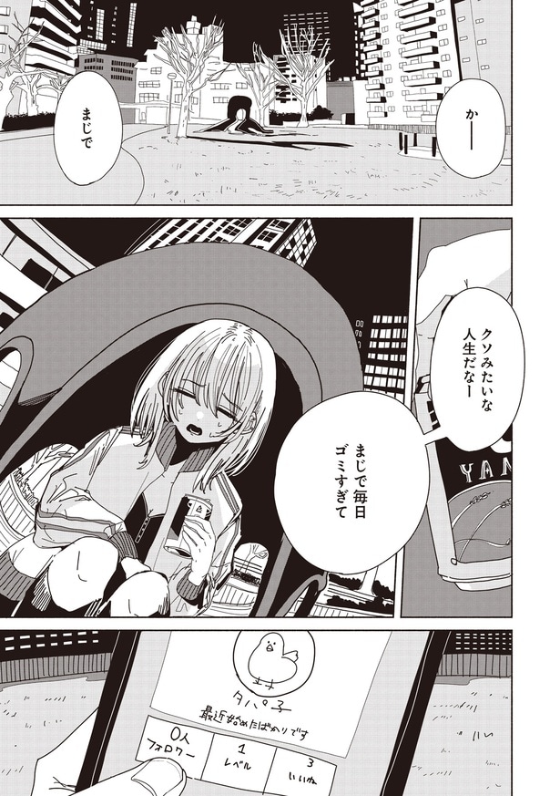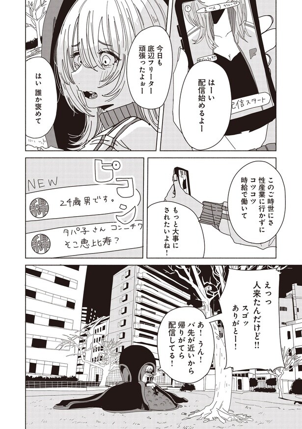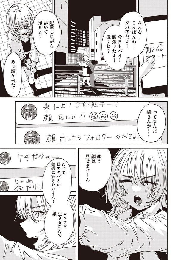 26歳のフリーター・浅野加菜子はパスタ屋でアルバイトをしている。バイト後、浅野はSNSで「タパ子」という名前で配信を始めた。するとたった1人の視聴者・綿(わた)が配信に参加。綿との何気ない会話の途中で、タパ子は泥酔した男性を目撃する…。