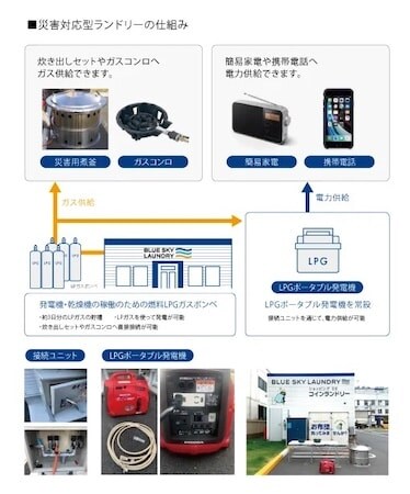 1点目は、全国261店舗が「災害対応型ランドリー」であること。災害時に一時避難所として機能できる設備を標準搭載している。乾燥機に使用するLPガスを発電や炊き出しに転用できるほか、ポータブル発電機や大釜も備え、停電時でも地域住民の生活を支える。