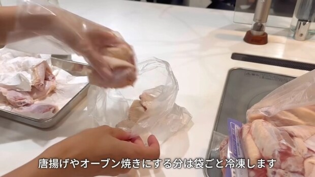 ayaさんは、スープ用や唐揚げ用、オーブン焼き用と用途ごとに袋に分け、そのまま冷凍保存。大容量の商品を冷凍する場合は、後ほど使いたい分だけ解凍できるよう、あらかじめ必要な量を小分けにしておくのがポイントです。