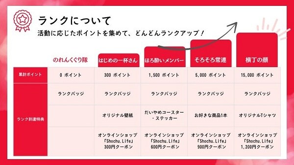 「だいやめ横丁」では、ログイン・投稿・コメント・いいねなどの活動に応じ付与されるポイントを集めると、「のれんくぐり隊」→「はじめの一杯さん」→「ほろ酔いメンバー」→「そろそろ常連」→「横丁の顔」とランクアップ。ランクが上がるごとに、ランクバッジやノベルティ、公式オンラインショップ「Shochu.Life」で使えるクーポンがプレゼントされる。