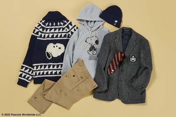 気になる新作ラインナップは、トレンドに左右されないベーシックなアイテムが中心。メンズをメインに、ウィメンズのアイテムもそろう。紺ブレやレタードセーターといったアメトラルックに身を包んだスヌーピーや、ボウタイでおめかしをしたウッドストックのデザインがあしらわれ、クラシックで王道のアイテムにユーモアがプラスされている。
