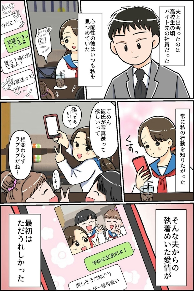 機能不全家族で育った主人公。高校生の時に出会ったバイト先の社員だった夫は、優しい彼氏だと感じていました。常に主人公の行動を知りたがる心配性な面も、自分に対する愛情であると信じていたのです。