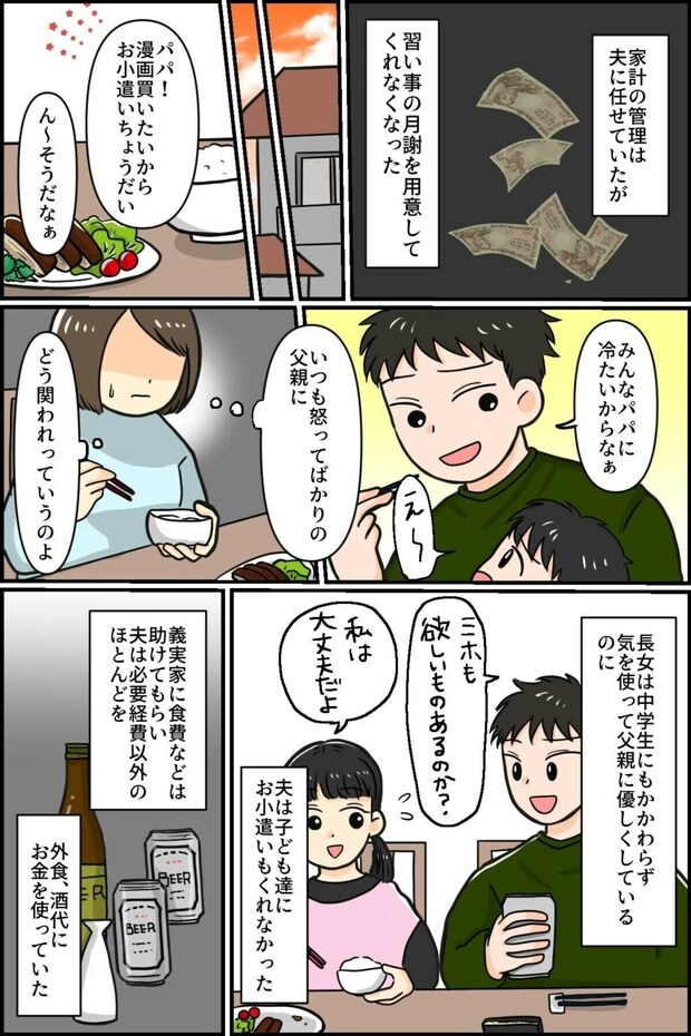 仕事を始めていた主人公は、経済力を身につけました。また、裁縫のサークルに通うようになり、近所の女性たちに話を聞いてもらう機会もでき、アドバイスも受けることができる環境になりました。