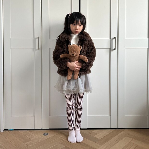 アウターがもこもこボリューミーなので、パンツはタイトにバランスよく◎