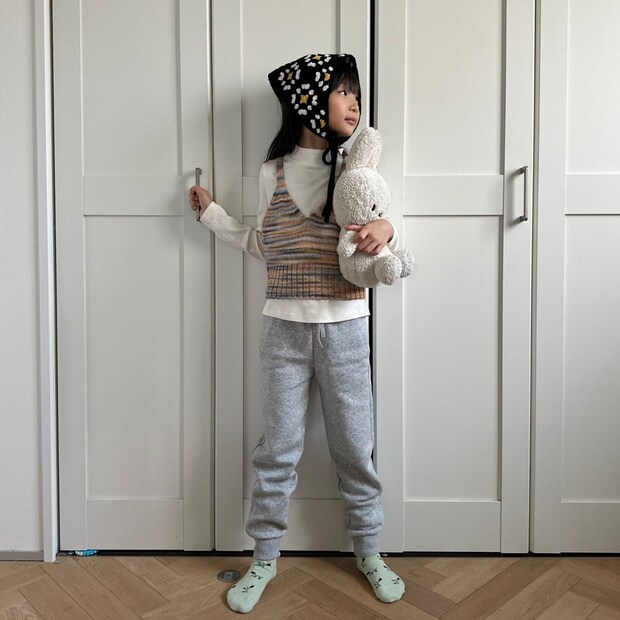 スウェットパンツはカジュアルになりがちなので、お花やビスチェ等ガーリーなアイテムをプラス♡