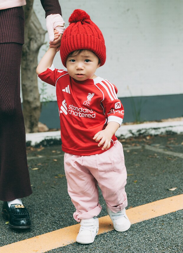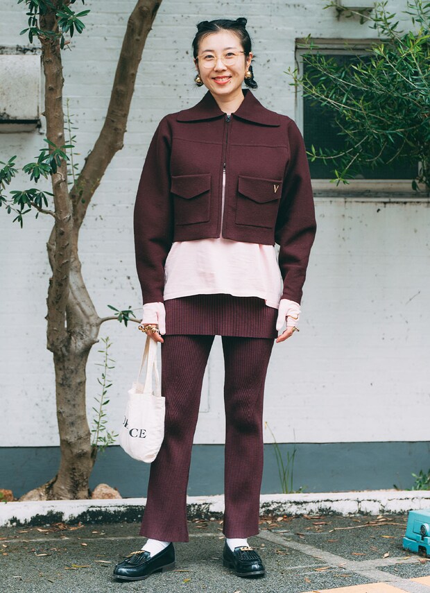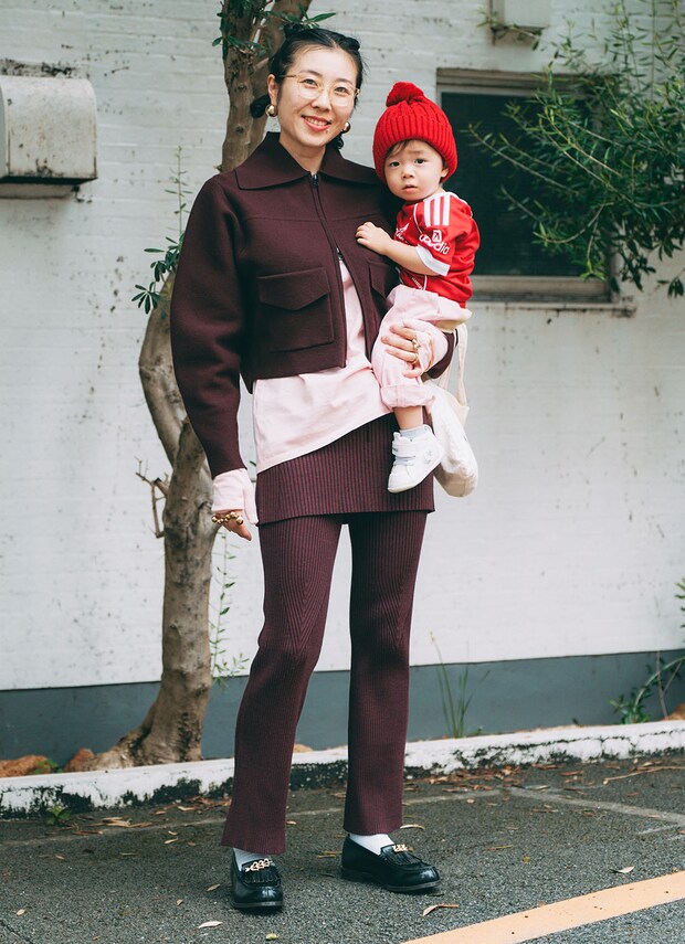 暗くなりがちな秋の装いも、ペールピンクを挿してプレイフルに仕上げた親子コーデがおしゃれ! お互いレッドトーンでまとめて、統一感も忘れずに。ママのセットアップ風スタイルに、ユニークな小物を効かせたテクはお見逃しなく。