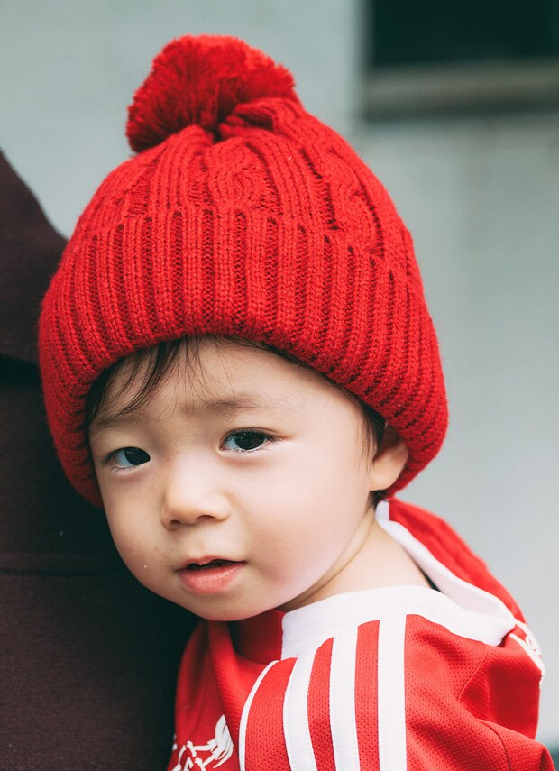 真っ赤なポンポン付きのニット帽に視線集中! 『西松屋』のプチプラアイテムながら、存在感抜群なアイテム。